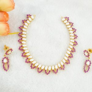 Pink Pearls 4-Rows Choker Set with Zircon Centre Piece and Studs.