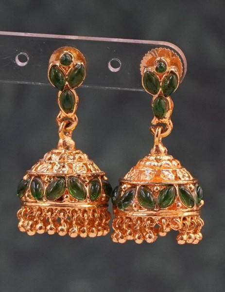 Shop handcrafted Antique Green Jhumki earrings featuring vibrant green stones and antique gold finish. Ideal for weddings, festivals, and ethnic outfits.