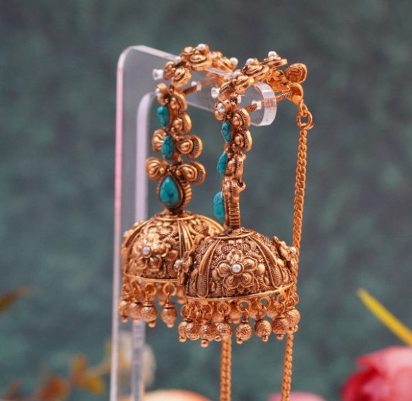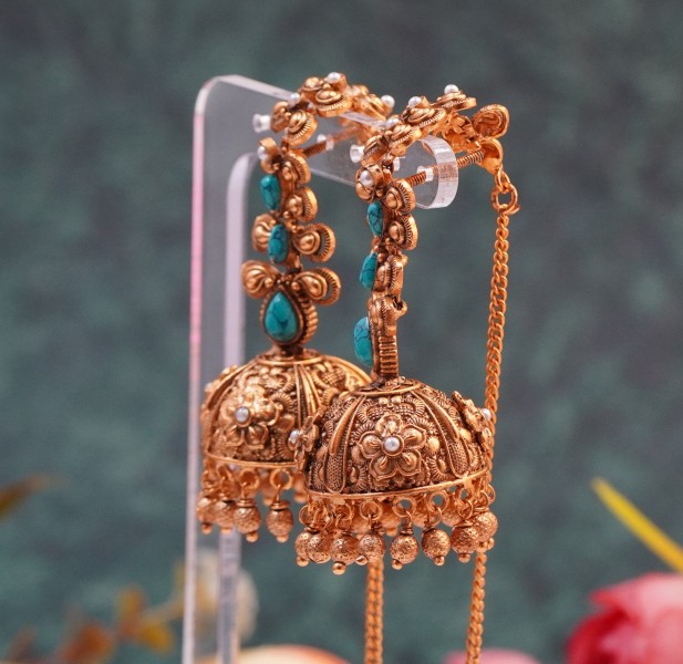 Explore the beauty of Antique Turquoise Blue Jhumki Earrings, perfect for traditional occasions and ethnic wear. A classic addition to any jewelry box.