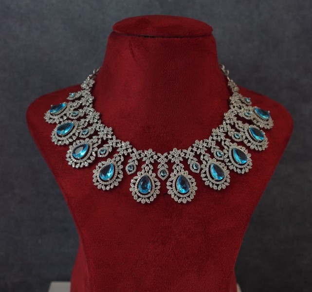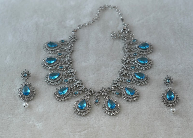 Add royal charm with the BT Blue and CZ RH Necklace Set. Features vibrant blue stones, CZ sparkle, and rhodium polish – perfect for weddings, parties, or gifting.