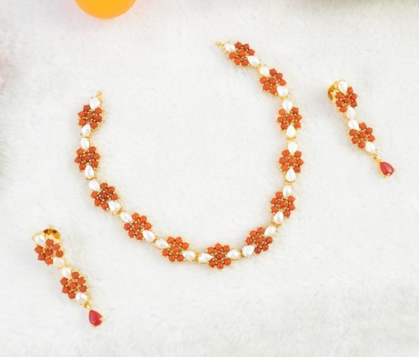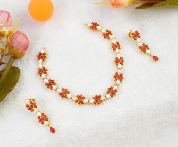 Shop our Coral and Pearls Necklace Set – a beautiful handcrafted jewelry piece with vibrant coral beads and classic pearls. Perfect for festive and formal wear.