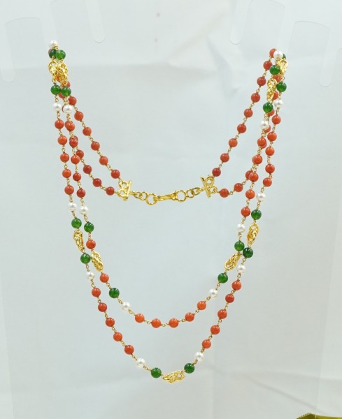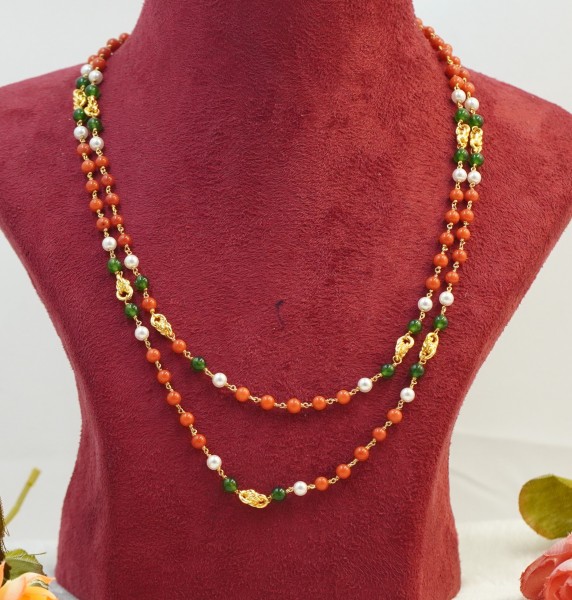 Elevate your ethnic look with this Coral, Pearls and Jade 2 Rows Kambi Mala – a perfect blend of color, tradition, and elegance for festive and casual wear.