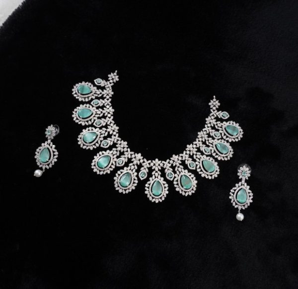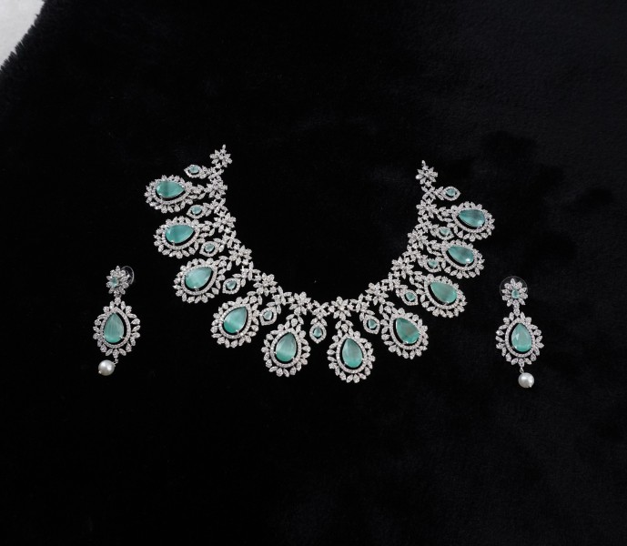 Add elegance to your outfit with this stunning Pista Green CZ RH Necklace Set. Perfect for weddings, parties, or gifting. Shop now for timeless beauty.