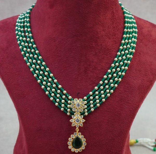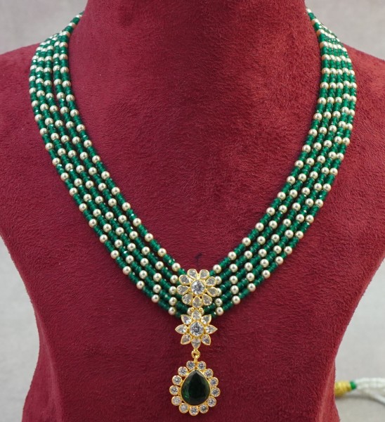 Elevate your style with this elegant 5-row Green and Pearls Beads Mala – perfect for weddings, festivals, and traditional events. Limited stock available!