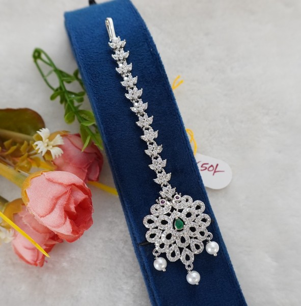 Shop Green White RH Netti Chutti online – rhodium-finish forehead jewelry with green and white stones. Ideal for South Indian brides and Bharatanatyam dancers.