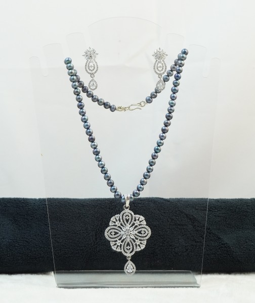 Grey Pearls with Zircon Rhodium Locket Set