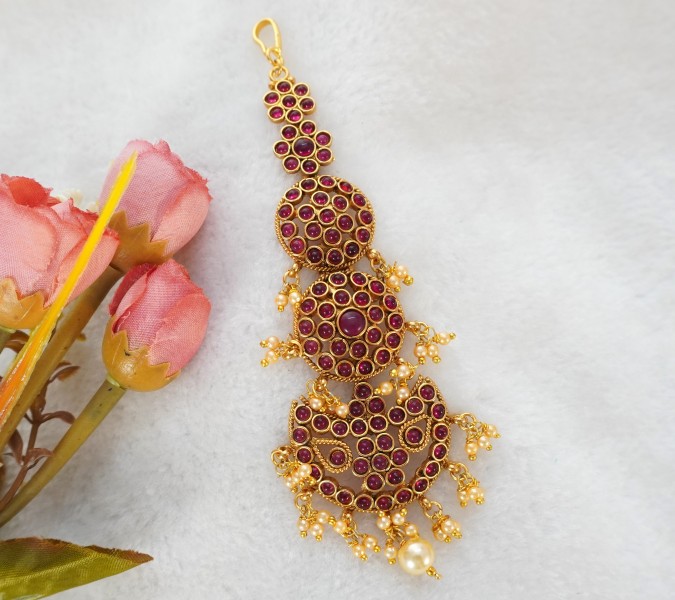 Explore Kemp Traditional Netti Chutti – Antique gold-finished forehead jewelry with red and green Kemp stones. Ideal for South Indian weddings and Bharatanatyam performances.