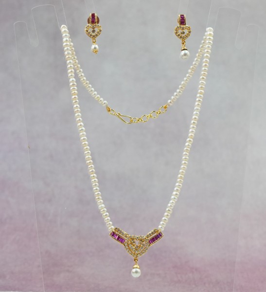 Graceful Pearls with Red and White Stone Locket Set – includes matching earrings. A perfect festive necklace for weddings, temple visits, or gifting. Lightweight & elegant.