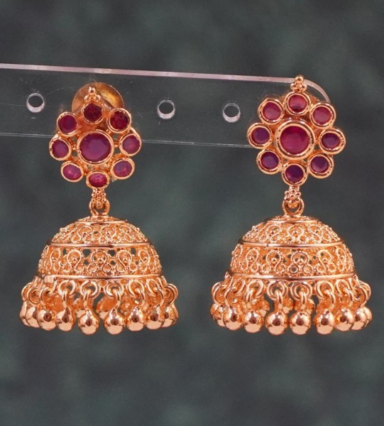 Shop handcrafted Red Kempu Jhumki earrings featuring rich red stones, antique gold finish, and traditional temple designs—perfect for weddings and festivals.